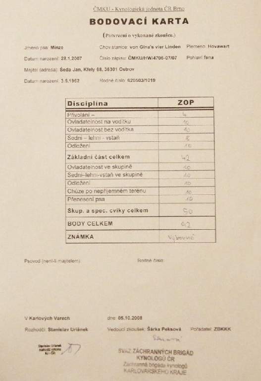5.10.2008 – Těžce zkoušená Minda Vyběhli jsme na plac a čekali, co tomu řekne pan rozhodčí, jako že jestli se ta naše čubajzna už něco naučila. Nakonec řekl 92. Tedy bodů. Ve zkoušce ZOP. Kdyby nebyl páníček mameluk a zamyslel se, jak se učí volno, bylo by to ještě lepší, ale kdyby-chyby, nemáme se za co stydět; další malý krůček máme za sebou.
